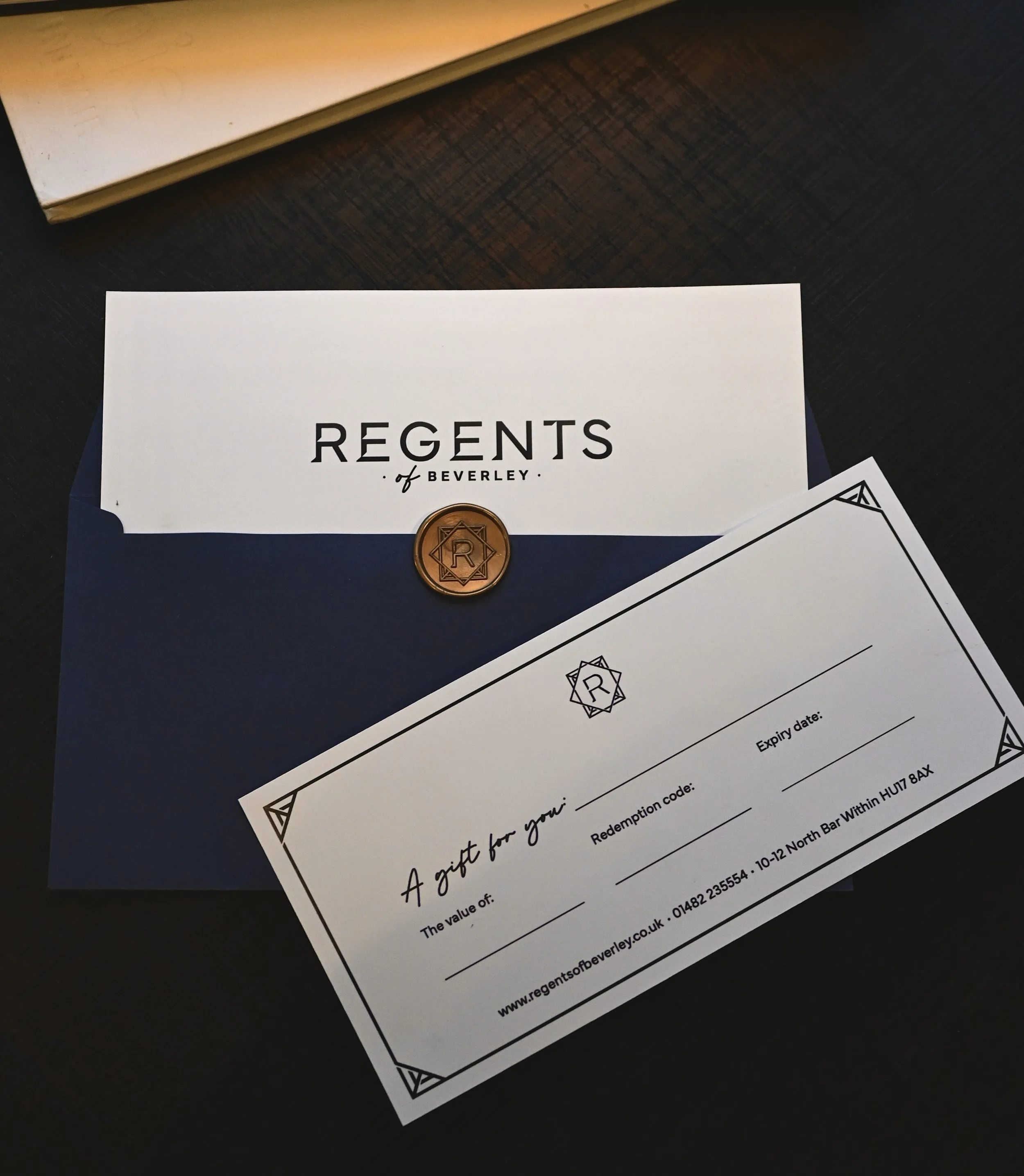 Pop into Regents of Beverley to purchase a physical gift voucher. Your voucher can equal any monetary value and is printed on high quality paper, with a navy envelope and a Regents wax seal, as shown in the photograph above.